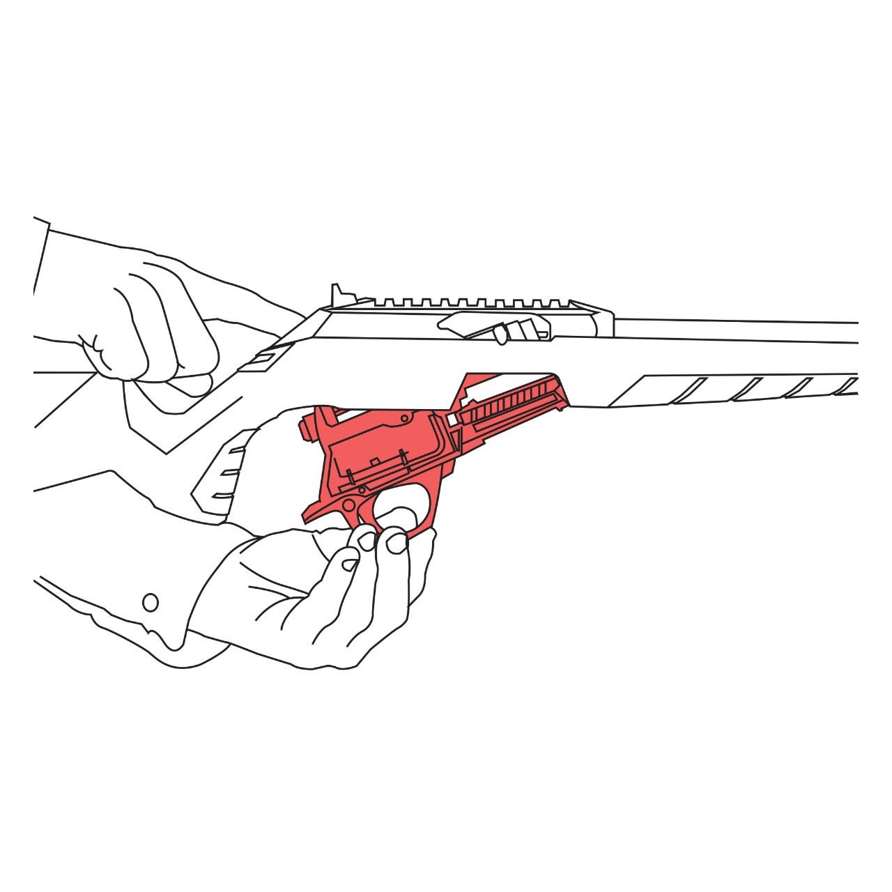 Der untere Teil des Gehäuses, zusammen mit dem Schloss und dem Abzugszüngel, kann leicht vom oberen Teil abgenommen werden, indem man mit dem Finger auf einen Knopf hinten am Gehäuse drückt. Es werden keine Werkzeuge benötigt! Der manuelle Sicherungsknopf ist leicht umschaltbar, so dass er von jedem Schützen, ob Rechts- oder Linkshänder, einfach zu bedienen ist.